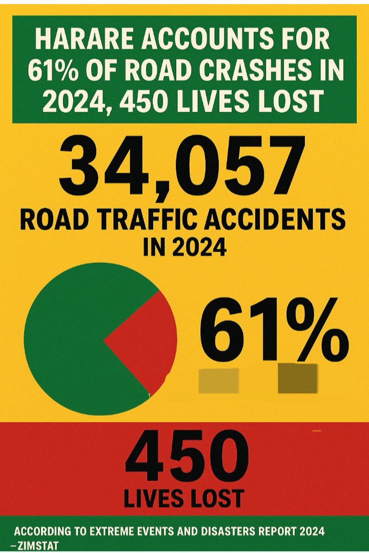 Harare recorded an alarming 34,057 road traffic accidents in 2024, making up over 61% of all accidents reported nationwide and claiming 450 lives, according to the newly released Extreme Events and Disasters Report 2024 by the Zimbabwe National Statistics Agency (ZIMSTAT).